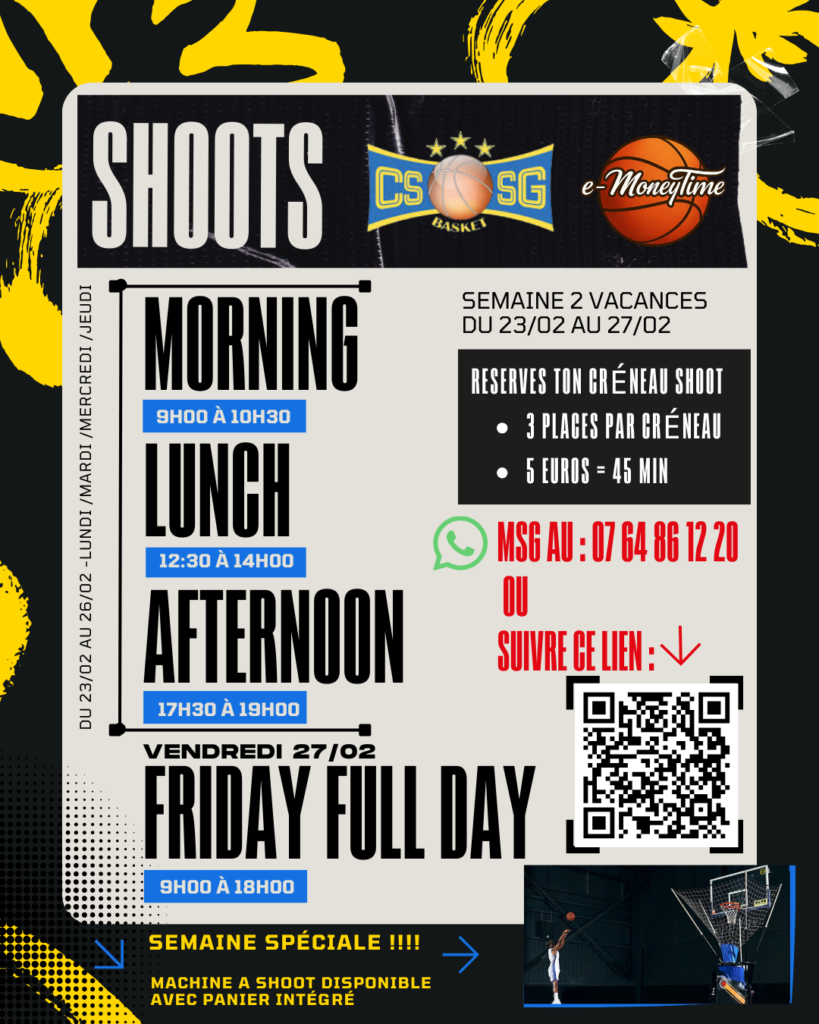 Pour ceux qui veulent participer chaque jours aux camps de basket (du lundi au jeudi) = 1 créneau shoot le vendredi est offert.